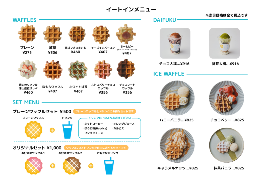 晴レのワッフルだけでなく、季節ごとの晴レのワッフルのデザートやドリンク類も充実しています。詳しいメニューについては、INN-SECT津山店のInstagramをご覧ください。